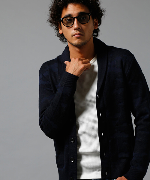 角度によって浮かび上がるシャドー迷彩柄ジャガードのカーディガン。すっきりとしたショールカラーがカジュアルさを程よく引き締めています。シンプルなインナーやフーディなどに重ねたレイヤードスタイルにもおすすめ。デイリーの定番として活躍するライトアウターです。ポケット付き。
