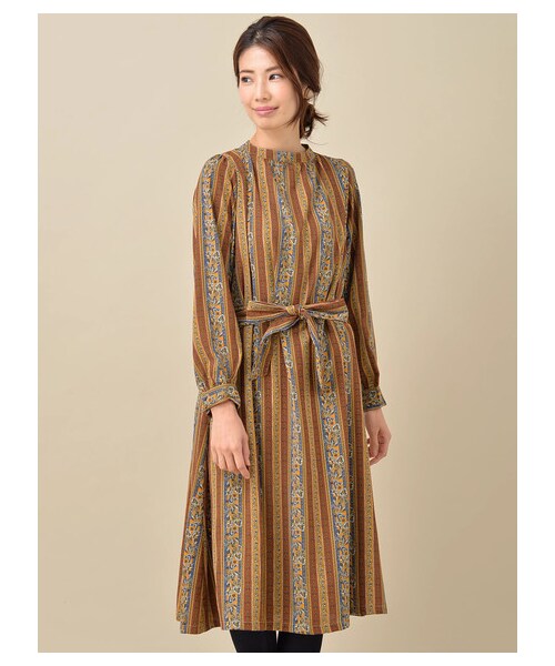 オリエンタルなストライプ柄で、存在感のあるスタンドカラーワンピース。 しなやかに揺らめく裾が、動く度に視線をキャッチします。 リボンベルトでウエストをマークすれば、メリハリのある美シルエットをメイクし、スタイルアップ魅せ効果も期待出来ます。