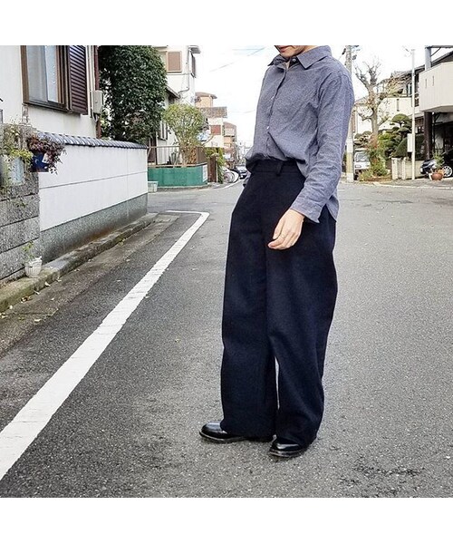 画像クリックで拡大できます 表がウール、裏がコットンの二重織になった 珍しいかつらぎ生地のストレートパンツ。 肉厚ですが、しなやかで柔らかいので ゴワゴワせず落ち感がとてもきれいです。 また、生地の質感を損なわないよう、 出来るだけステッチが見えないように仕立てました。 前はゴムを入れず、 ポケットも後ろ側へ回るようにして、 楽にはけるのにスッキリと見えるよう工夫しました。 股上も深すぎず浅すぎないので、 ジャストウエストでも、 わざと落とし気味に履いてもカッコいいと思います。 ベルトループも付けたので、 お好みでベルトを通しても履いていただけます。 ポケットの内布は 総柄シャツの生地を使って 見えない所もおしゃれに仕上げました。 お色は濃いネイビー。 スッキリとクールなイメージです。 ホワイトやグレーはもちろん、 カーキやベージュなどとも合わせやすいので、 コーディネートを楽しんでくださいね。 裾上げについて。 裾は「てまつり」でステッチが出ない方法で仕上げています。 ご自身で裾直しをされる場合は、 まつってある部分をほどいて、 裾は切らずに必要な長さまで折り上げてまつってください。 そうすることで、表に折り上げると、 短めのダブル仕立てのように履いていただくことも出来ます。 また、お直しをご希望の場合は、 ご注文の際に、メッセージ欄に股下の明記をお願いいたします。 SIZE: FREEサイズ COLLAR:ダークネイビー QUALITY:ウール50% コットン50% お手入れ方法 ネットに入れていただいて中性洗剤で手洗いしていただけます。 ウールが入っていますので、 縮みが心配な場合はドライクリーニングをお勧めいたします。 生地の特質上、毛玉が出来やすいので、 その際は、毛玉取り器などでお手入れをお願いします。 また、感じ方には個人差がございますが、 若干チクチク感じる場合がございますので、 タイツやレギンスなどと 合わせて履いていただくことをお勧めします。 サイズ ウエスト 64~74cm ヒップ 106cm 股上 29cm 股下 74cm 太もも幅 30cm 裾幅 25cm (平置きで測っていますので多少の誤差はご了承ください)