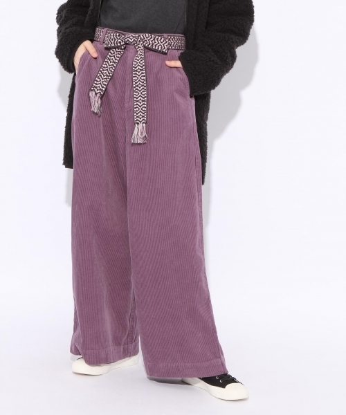 今年トレンドのコーデュロイパンツに、人気のエスニックベルトをセットしたおすすめの一枚。 パンツは製品洗いを施すことで、ソフトな風合いに。 ワイドシルエットながら、フロントのウエスト部分はすっきりとしているので パンツだけでも履いていただきやすいアイテムになっています。