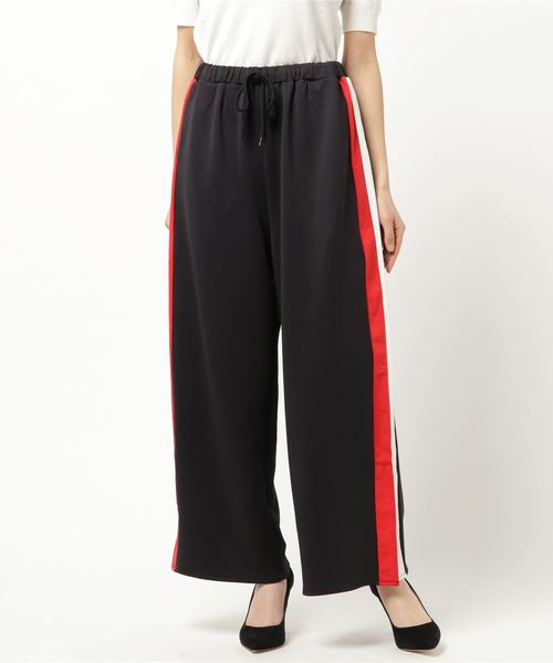 両サイドのカラーラインとスリットがアクセントにもなっているジャージパンツ。 ワイドシルエットをベースにルーズ感もあり、リラックス感がありながらもサイドラインが 全体を引き締めラフ過ぎないのもポイント。 また、ウエストは紐付きのゴム仕様でウエスト位置を調整でき、全体のシルエットを隠しつつも脚長効果もあるアイテムです。