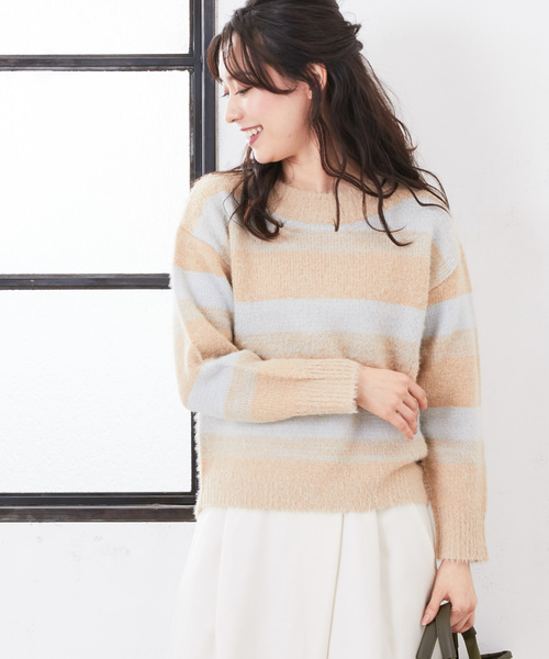 ハンドペイントのようなラフなラインとカラーバランスが魅力的なボーダーニット。バックスリットが入っているので、後ろ姿もすっきり見せてくれます。柔らかい素材感でストレスフリーな着心地もポイント。ショート丈なので、スカートからパンツスタイルまで着回し力抜群のアイテムです。