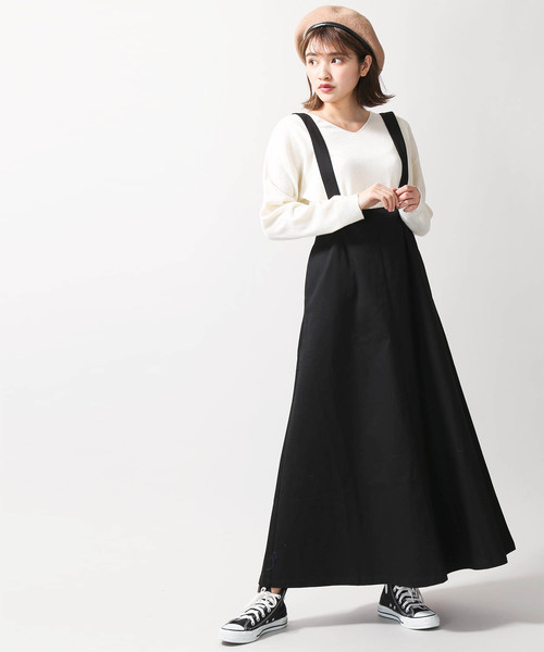 サス付きデザインで仕上げたロングスカート。サスペンダー部分は取り外しが可能ですので、2WAYで着用頂けるのが嬉しいポイント。ストンとした落ち感が綺麗で、スタイルよく見えるラインにこだわりました。バックウエストはゴム仕様で、リラックスして快適に着用頂けます。今季はショート丈トップスと合わせたり、ベレー帽やチョーカーなど、小物で遊びを効かせたコーディネートもオススメです。