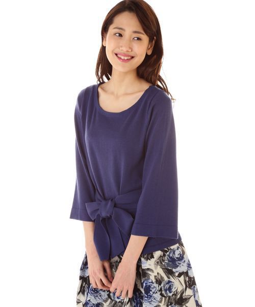 ブラウス見えするように、襟付属を付けずに見返しの仕様でスッキリと仕上げたニットです。脇に挟み込んだリボンは前後どちらでも結べる仕様で様々なアレンジが出来ます。