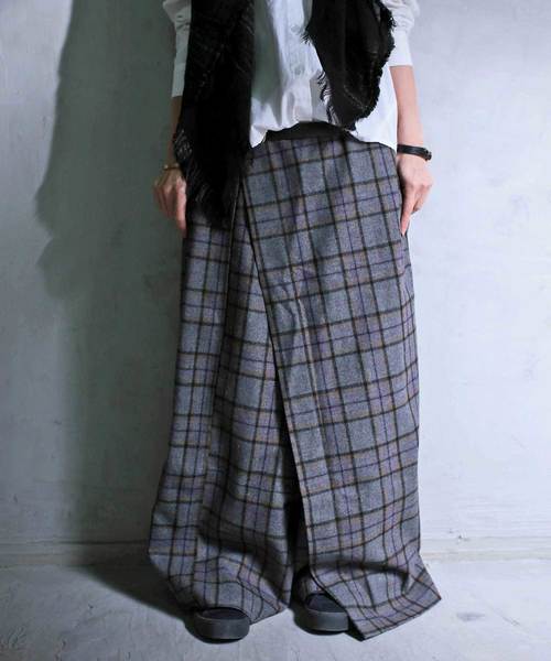 デザイン性に圧倒される。 チェッククロスカフェパンツの登場です。お洒落なカフェパンツのシルエットに今期は欠かせない旬なチェック柄を落とし込んで…。 今回はウール混の季節感ある素材を使い、暖かに。チクチクしないように裏地付きです。スカートのような女性らしい雰囲気のシルエット、だけどチェック柄がハンサムさも醸し出してくれる。 シンプルなようで、断然違うお洒落なこだわりをつめ込んだこの形、ひとつは持っておきたい一着です。 ※柄のつなぎ目は合っておりません。また、柄の出方は1点1点異なります。ご指定はできかねます。ご了承の上お買求め下さいませ。