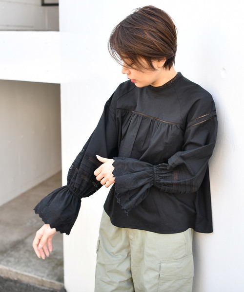 甘すぎないレースブラウスで春の装い胸元とショルダー部分にはシンプルな梯子レース、袖口部分にはまた印象の違う華奢なレースを使用し、袖口部分には生地同色の刺繍を施した贅沢なブラウス。すべてを同色で仕上げることで派手になりすぎず、生地も適度に厚みのあるコットン素材を使用することで、甘くなり過ぎず、カジュアルスタイルとも相性抜群の1着です!ボリューミーなキャンディスリーブは単色のブラウスのアクセントになるので、ボトムや小物はシンプルに合わせたスタイリングがオススメ◎レースの透け感や、バックスタイルの涙開きが抜け感をプラスしてくれるので、スニーカーやデニムなど、カジュアルなアイテムとの甘辛ミックスも可愛い!透け感があまりないので、春のみでなく秋冬にも使いやすいアイテムです。