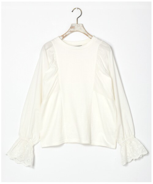 着まわしのしやすいカットソーは何枚でも持っていたいアイテムです。肩部分で異素材に切り替わっており、シャーリングがアクセントになったデザイン性のある一枚。袖先のスワトー刺繍が可愛らしく、ニットやカーデの袖先から見せるのも可愛いです。シャーリングが入っているのでたくし上げて着るとニュアンスが出て◎。綿100%で着心地がいいです。