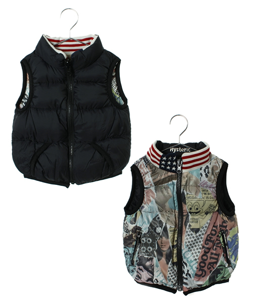 無地と総柄の対極なリバーシブルなのでボトムを選ばず、最高に軽い中綿のプリマロフトがKID’Sに最適なダウンベスト。