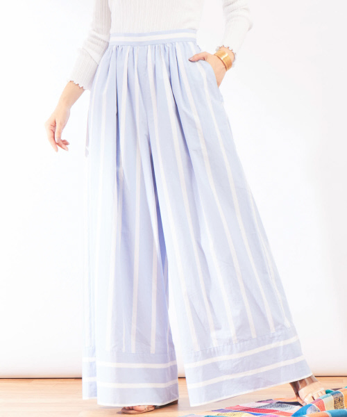 たっぷりとギャザーを寄せてスカート見えするワイドパンツ。ポイントはなんといってもインパクト大の太ストライプ。 トップスは無地のハイゲージニットなど、シンプルできれいめなものがおすすめ。 さわやかなサックスに、今シーズン注目の赤のカラーバリエーションです。