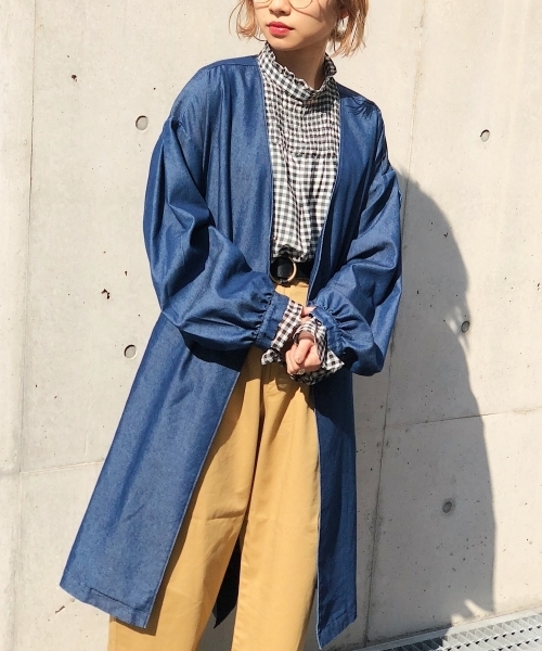 コーデに取り入れやすい定番のノーカラーガウン。 今年は袖コンシャスにして少しトレンドを取り入れました。 幅広いボトムに合わせやすい絶妙な丈感に仕上げ、デイリーに使いやすいアイテムです。 ノーカラーなので、ハイネックで合わせても◎ バックのヒモで、シルエットを調整できます! これからの時期は、 スプリングコートとしてもお使い頂けます!