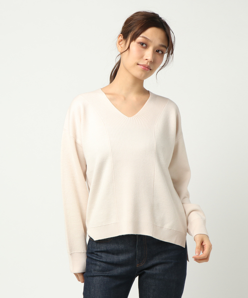 フロント部分のリブデザインがアクセントになるニット。柔らかく肌触りの良い素材で、ストレスフリーな着心地に仕上げました。綺麗なネックラインで女性らしさを演出してくれるのも魅力的。サイドにスリットが入っているので、INスタイルも楽しめるアイテムです。