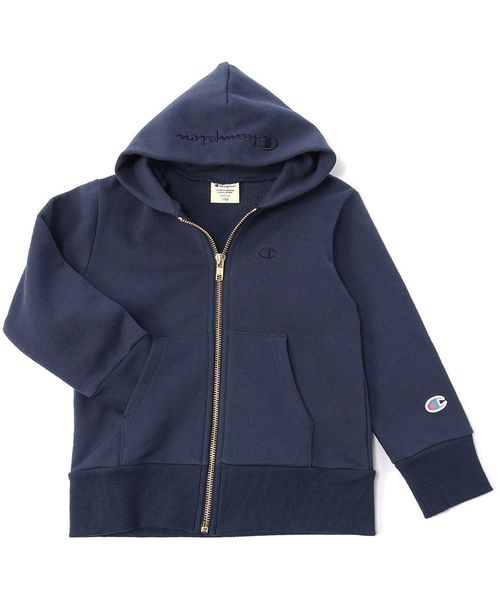 さりげないロゴがオシャレ。Champion(チャンピオン)のロゴ入りパーカー・フードと前胸についたロゴはあえての同色でさりげなさを演出・どんなシーンでも使いやすさ抜群の前開きパーカー・カンガルーポケット付き・左袖にはロゴワッペン付き