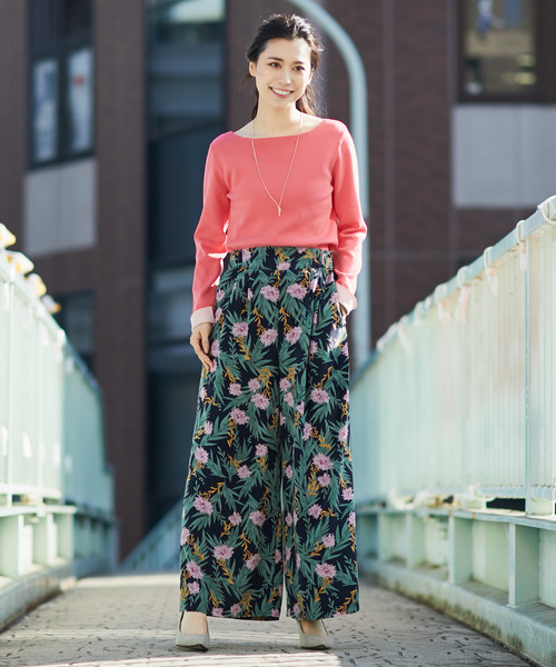 小手鞠のような可憐な花が印象的なリヴドロワ別注の花柄プリント。 今年の花柄のトレンド傾向の葉が多く、イラストのようなタッチのとてもキレイな花柄を選びました。 ハイウエストのワイドパンツになっており、前から見るとカマーベルトのようになったベルトのデザインが特徴的。 後ろは、ゴム仕様なので、着心地はストレスフリーになっています。 同柄のセットアップがおすすめです♪ レースフラワープリントブラウス RD18A0040090100