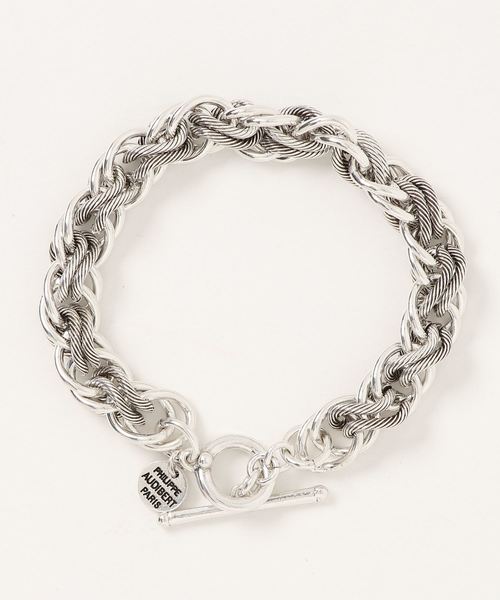 PHILIPPE AUDIBERT (フィリップ オ―ディベール) チェーンアクセサリー複雑に編み込まれたデザインで男らしさを演出します!!複雑に編み込まれたロープのようなデザインのブレスレット。シンプルながらも繊細で丁寧な作りは、手元に存在感を与えてくれます。様々なスタイルに取り入れやすく重ね付もおススメです。PHILIPPE AUDIBERT (フィリップ オ―ディベール)デザイナーであり彫刻家であったPhilippe Audibertが1988年にスタートさせたジュエリーブランド。 品質、デザイン性ともに非常に高く、フランスのブランドならではのシンプルでスタイリッシュなラインナップ。 チェーンを用いたスタイリッシュなルックス&シルバーカラーが、手元を品良く印象付けるブレスレット。輪にピンを通すマンテルを採用したことで、スムーズな着脱を可能にした1品。メイン使いはもちろんのこと、重ね付けにもおススメです。巾着袋有り。