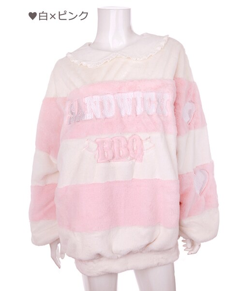 ♡Bobon21 2017Winter New Collection♡ 英字ボーダーのフリーストップス ざっくりオーバーサイズがキュート モコモコフリース素材で暖かく 襟は女の子らしいラウンド襟+フリル 袖はハートのデザインになっているよ 白×ピンク・白×ココアの2色展開
