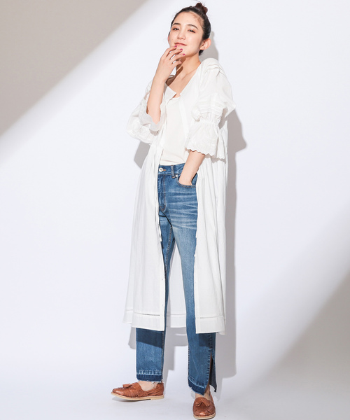 コットン素材が程よい抜け感を演出してくれるワンピースは、ナチュラルな風合いのある同色刺繍で落ち着いた雰囲気に。ウエストギャザー切替からふわっと広がるスカートシルエットと、袖口ゴムのキャンディースリーブが大人かわいいを演出。所々に使われたレースや袖口の刺繍はシンプルになりすぎない、さりげないポイントです。前開きの仕様なので、ウエストベルトを絞ってガウン風に着るのもオススメ。1枚でワンピーススタイルはもちろん、デニムやパンツとのレイヤードで旬な大人カジュアルなリラクシースタイルを楽しんでみて下さいね◎