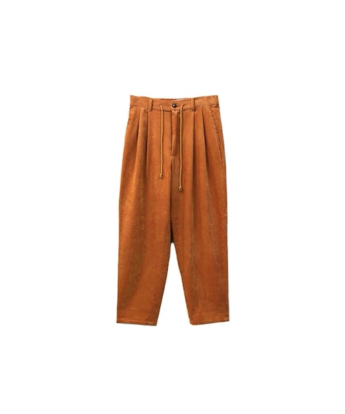 yotsuba コーデュロイ ワイドパンツ。 通常よりも太ピッチで、ふっくらとしたボリューム感のあるコーデュロイ生地。 2タックのワイドな腰回りから裾に向かってテーパードしたシルエット。 ウエストにはドローコードが施されておりベルト無しでもお召しいただけます。 トップスを選ばずオールシーズン活躍してくれる一本で、 体型問わず、男女共にオススメです。 サイズ展開 [1・2] カラー展開 [オレンジ・ピンク・ブラック・バーガンディー・グリーン・ブラウン]