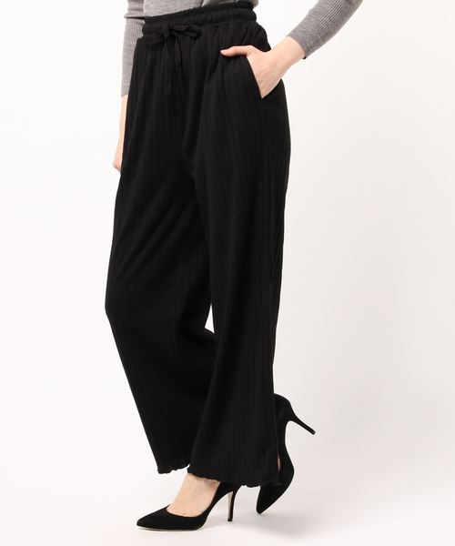 落ち感のあるリブニット仕立てのワイドパンツ。裾をメロー始末にすることでカジュアルさを品よく昇華させています。ドロスト入りのウエストがジャストなフィット感を叶えてくれるのも嬉しいポイント。裏地付きなのでまとわりつきにくく、きれいめに着こなせるのが◎。オンオフを問わず活躍させて。