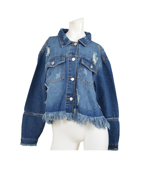 後ろが短めにカットされたショート丈ジャケット☆ ハードなダメージ加工を施したデニムがポイント! ハイウエストボトムと好相性のライトアウターです♪
