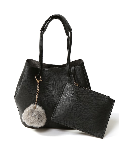 ボリュームのあるファーチャームがセットになったお得なトートバッグ♪ シーズンやコーデを選ばず使えるベーシックなデザインがうれしいトコロ◎ 口が広く中が取り出しやすいデザインと、ポーチで収納力抜群☆ ★ファーチャームは取り外し可能です。