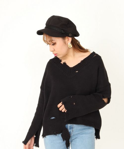 大胆なダメージがエッジィな存在感を放つニットトップス。 ざっくり開けたネックラインや肩を落としたゆるシルエットも女性らしいヌケを添える好ディテール◎コットン混の素材使いで、ロングシーズン快適に着用できるのも魅力です。 定番ボトムスとのワンツーコーデもサマになる1枚は、デイリーユースも高まりそう!
