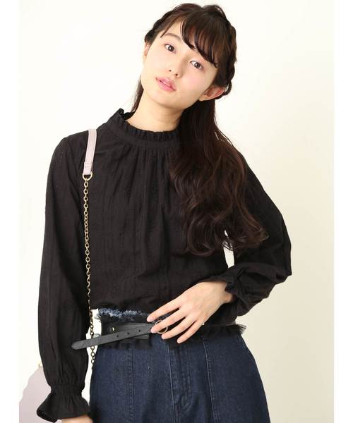 フラワー刺繍をあしらった可愛らしいプチハイネックブラウス♪フロントにギャザーを入れることで、立体感のあるゆったりめのシルエットに仕上げました。背中のさりげない肌見せもポイントです。ジャケットやブルゾンのインナーとしてもおすすめ! 裏地有りです。