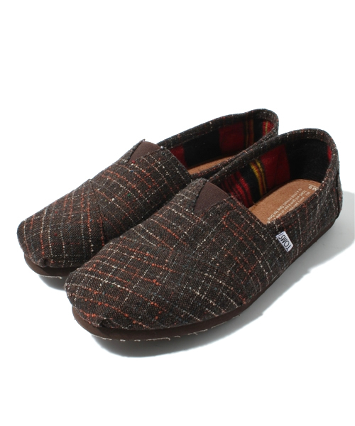 TOMSの中で最も人気な定番のクラシックシリーズ。 軽さ、履き心地を重視したシンプルなデザインは どんなコーディネートにも似合います。 秋から冬にかけては派手目なソックスやレギンス、そしてハーフパンツや半端丈のパンツなどと相性がよい。最近では部屋履きやベランダ・庭用にTOMSを愛用する人も急増。男女問わず大人気のブランド。(トムズ) 世界で誰かがTOMSを1足購入する毎にアルゼンチン、南アフリカの貧困の為に裸足で生活をしている子供たちにTOMSのシューズを1足プレゼントする、という活動も行っている。アルゼンチンの人々が履いていた「アルパガータス」と呼ばれる(サンダル麻やジュードを編んで作った底に、キャンバス地のトップをつけたもの)サンダルをヒントに “Shoes for TOMorrow (明日への靴)”という思いが込められ作られています。