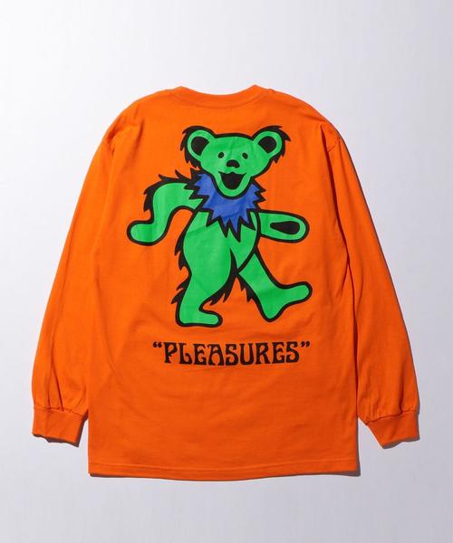 <PLEASURES>とTHE GRATEFUL DEADによるオフィシャルコラボレーション。 <PLEASURES> ロサンゼルスのストリートシーンで新興勢力として注目を集めている<PLEASURES>。 デザイナーの「Alex James」が<PLEASURES>で提案するのは、自身が90年代に出会ったカルチャーを、グラフィックやタイポグラフィーで落とし込んだデザインです。 THE GRATEFUL DEAD ジェリー・ガルシアを中心に1965年に結成されたロック・グループ。 そのむさ苦しい風貌とは裏腹に、自由と愛と平和に溢れたメッセージを送り続けたバンド。ヒッピー・ムーブメントの背景もあり、彼らに共感する熱心なファン層が拡大し、数々のコンサートを行った。またコンサートでは、録音も自由、そのテープを交換するのもOKといった彼らのスタンスも特徴的であり、彼らも、ファンも非常に純粋な志を持ち、温かい集団であった。日本では、「尊厳死」を意味するネーミングや、「ガイコツ」、「バラ」といったキャラクターにより、サイケデリックなバンドとしての偏ったイメージが先行していた所があるが、しかし当時も彼らに共感し、何度も海を渡った若者も多数存在したほどの魅力あふれるロック・グループ。 1995年にジェリー・ガルシアの他界により活動を休止するも、グレイトフル・デッドのフォロワーとしてフィッシュ、ストリング・チーズ・インシデントといったバンドが誕生するなどシーンは継続されている。 2015年には、フェア・ジー・ウェルと題された大きなツアーが行われ、世界中のデッド・ヘッズ(熱狂的なデッド・ファン)が会場のサンタクララやシカゴに集った。 店舗へお問い合わせの際は、全国のBEAUTY & YOUTH 各店舗まで下記の品名/品番をお申し付け下さい。 品名:PLEASURES×GD BEAR LS T 品番:8312-343-0404