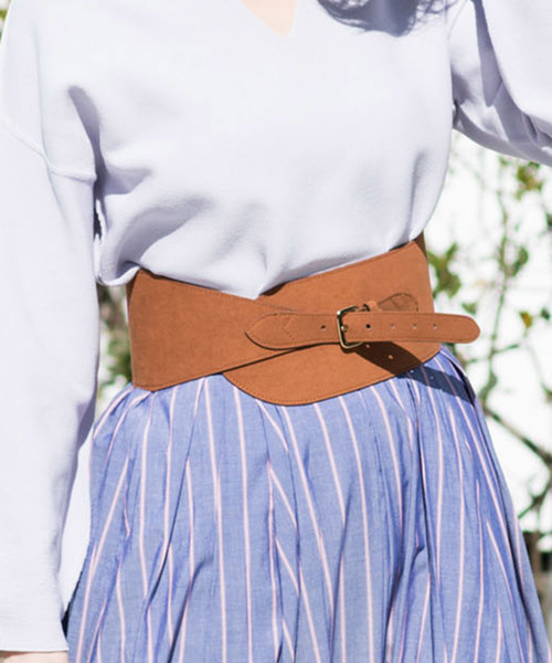 太ベルトはウエストを細く華奢に見せてくれる優秀アイテム。スエード生地がリュクスな高級感を漂わせます。ワイドパンツやワンピースなどとの相性が良く、ハイウエストで付ける事によって、脚長効果が得られる優れもの。いつもの装いにプラスワンで、ワンランク上のコーディネートが楽しめます。