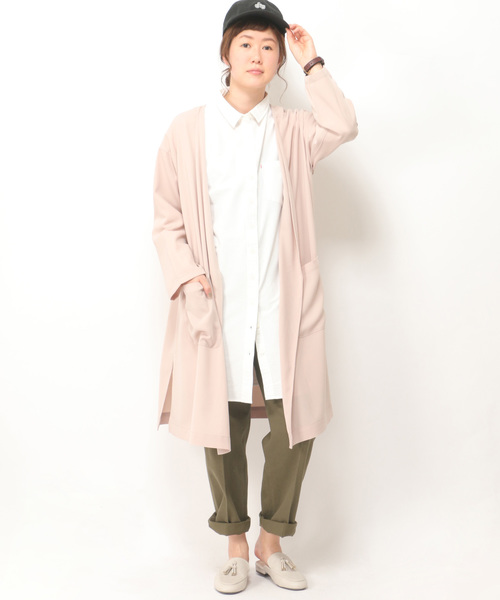 てろんとしたブラウス風の生地を使った、きれい目な雰囲気のカーディガン。ボタンレスでガウンのように気軽に羽織れて、ライトアウターとして活躍してくれます。たっぷり長めの着丈ですが、サイドスリット入りで軽快な雰囲気。手持ちのベルトでウエストマークするアレンジもおすすめです。[クリーニング]洗濯機洗い可(非常に弱く)ドライクリーニング可(P)ウェットクリーニング(W)[洗濯方法]洗濯の際はネットを使用してください