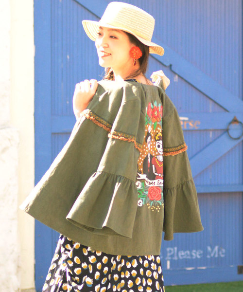 バックスタイルにあしらわれた、メキシコのカラベラプリントと花刺繍が豪華なショートジャケット。 カラベラはメキシコの画家、フリーダ・カーロとディエゴ・リベラをモデルにしています。 フレアスリーブが女性らしさを演出。軽やかに羽織れるノーカラージャケットです。 ※こちらの商品は1点1点職人による手作りとなります。その為、形や色合い・模様など若干異なる場合がございます。あらかじめご了承ください。 ※屋外での撮影画像は、光の当たり具合で色味・カラーが違って見える場合がございます。商品のカラーは、スタジオ撮影の画像をご参照ください。 Amina Collection Co.,LTD.
