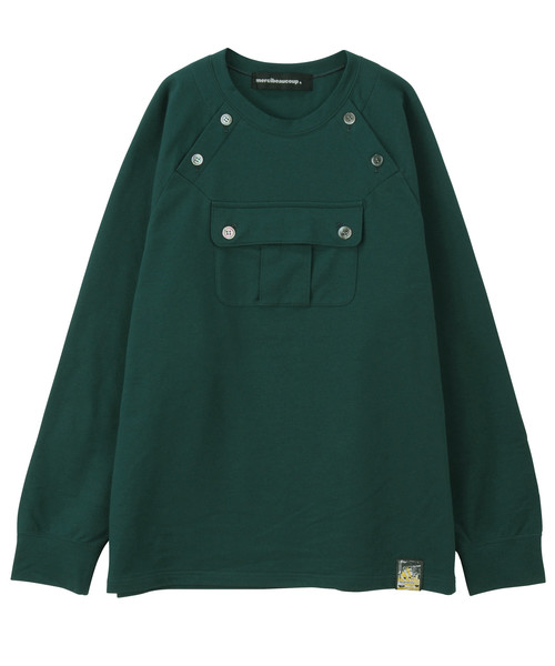 マリンをイメージしたラグラン切り替えの長袖カットソー。胸元のポケットがポイント。無地なので何にでも合わせやすく、シーズンレスで活躍するアイテム。少し個性をだしたいときにおすすめです。