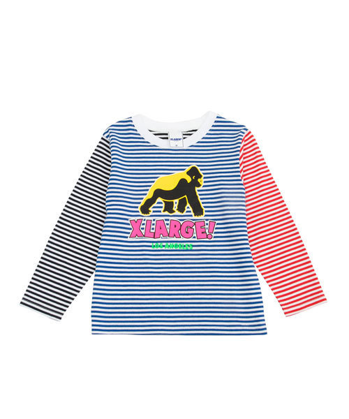 ストライプ生地を左右袖、前後身頃の4面でクレイジーカラーに切り返したマルチストライプTEE。フロントにウォーキングゴリラロゴをポップなカラーでプリント。※2Tのみ、左肩片開きあり。