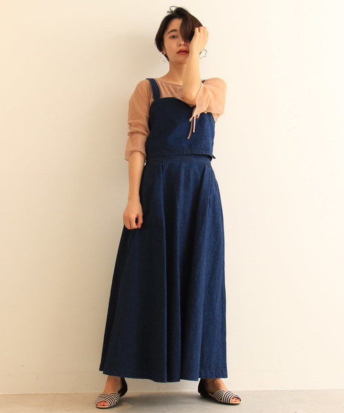 【大人気の為追加生産決定!!】 シーズンライクな麻混素材のロングスカート。デニムのカジュアルな質感に麻独特のハリと自然なネップが際立ち、トレンドのヴィンテージスタイルを演出します。太めのウエストベルトもレトロで、贅沢に布を使ったサーキュラーラインのフレアーシルエットが、着こなしを大人っぽく見せてくれます。後ろゴムで着脱が楽なのもポイント。同素材のビスチェ【131-8110008(店舗】とセットアップでの着用もおすすめです。