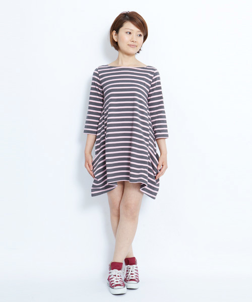 世界中のフレンチカジュアルファンの間で愛されているマリンボーダーのカットソーの老舗"Le Minor"とのコラボ。MILKFED.オリジナルカラーのボーダーを使用したスペシャルなアイテム。サイドについたドロップポケットがポイントのドレスは一枚で着用がおすすめ!左袖にMILKFED.のロゴテープ付き。