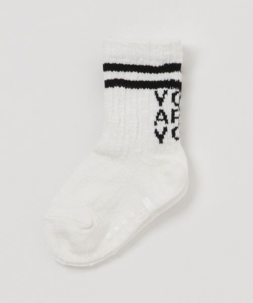 Size: XXS (9-12cm) SS(13-15cm) S(16-18cm) M(19-21cm) L(22-24cm) スラブ糸でできたロゴソックスの登場です。太幅の2本ラインを施し、ロゴを落とし込み、存在感を放つアクセントを加えています。これからの季節のスポーティカジュアルにおすすめの一足です。足裏に滑り止めがついているのでベビーから安心して履いていただけます。 maarookから新しい雑貨ブランド「MR」が2017SSデビュー!! maarookのテイストをそのままに、機能性を重視したありそうでなかった雑貨を展開しています。