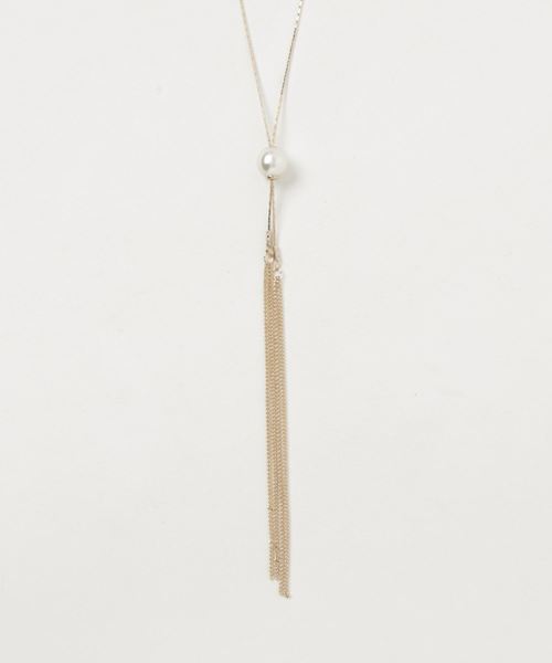 ほっそりとしたチェーンのフリンジを品の良いパールでまとめたネックレスです。 パール風チャームをスライドさせることで印象がガラリとチェンジ。 下げることでVラインを際立たせてシャープな雰囲気に、 また鎖骨まで上げてループタイ状に使用しても遊び心ある雰囲気に仕上がります。 シンプルなデザインで様々なスタイリングに使いやすいアイテム。