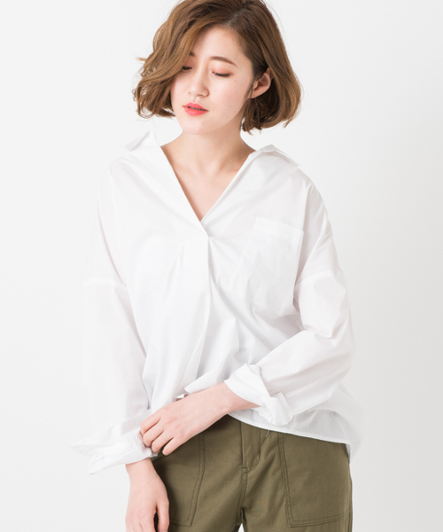 たっぷりとしたワイドシルエットが今年らしい一枚。脇線を前に振り、サイドにタックを取っているのでバックの裾周りに丸みがつくデザインになっています。襟は抜いて着るのが◎シワになりにくい素材なのも嬉しいポイント。そのまま一枚でゆったりと着たり、ビスチェを合わせてレイヤードスタイルもおすすめです。