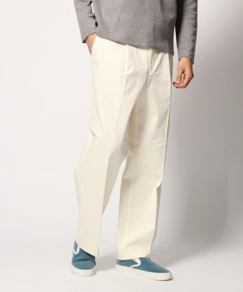 MY STYLE,MY CHINO. この春注目のチノシリーズ! トレンドのワイドシルエットのパンツはインド最大の生地メーカーのプレミアムストレッチチノを使用し、 高密度の織られた生地に表面を微起毛させることで高級感のあるソフトな風合いを実現しました。 ストレッチ性があり軽い素材でワイドシルエットでもストレスフリーで穿いていただける1本。 素材感を最大限に生かしたワイドストレートのシンプルなトラウザーデザインは 合わせるアイテムも選ばずスタイリングできるポイント。 この春注目のチノアイテム、ぜひご覧ください♪