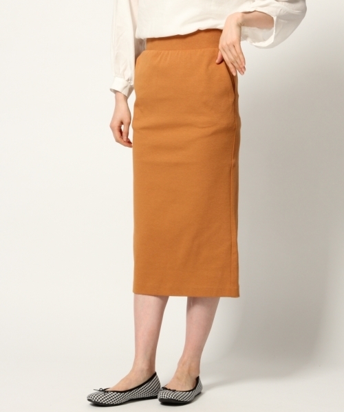 柔らかな穿き心地♪ 伸縮性のあるポンチ素材を使用したカットスカート。 動きやすさが出るよう後ろ部分にスリットがデザインされているので、 タイトなシルエットながらも窮屈さも少なく動きやすいデザインの1枚です。 長めの丈が女性らしくトップスインのスタイルもおすすめ! カジュアルな素材感ですが、キレイ目にスタイリングできるアイテムです。