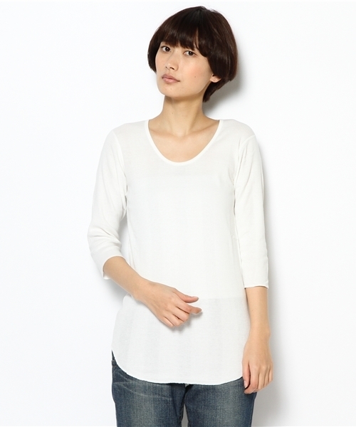 さらさらで柔らかなコットン素材を使用。ランダムテレコの優しくふんわりしたタッチが心地よい7分袖Tシャツです。人気の秘密はすっきりとしたネックと程よいフィット感。色違いで揃えるファンも多いアイテムです。 オーバーオールやシャツワンピのインナーに、ショートパンツやミニボトムスにとどんなアイテムにもはまるロング丈Tシャツ。もちろんコットン100%なのでオールシーズンお使いいただけます。いつものワードローブに定番としてプラス。くたくたになるまで愛用したい、クオリティの高いひと品です。 店舗へお問い合わせの際は下記品番をお伝えください。 品番:13-14-0039-295