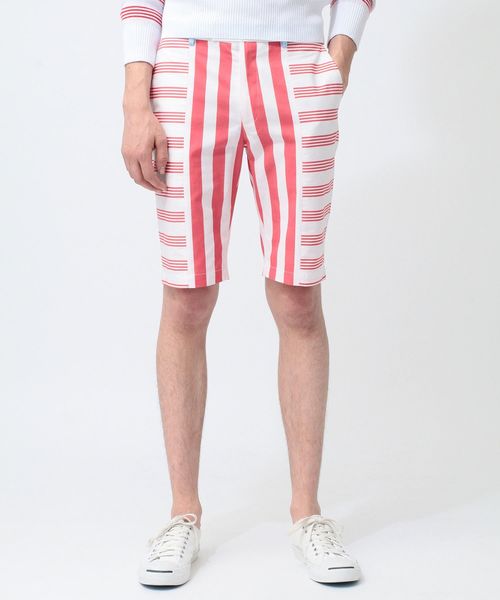 koe×THOM BROWNE デザイナー「THOM BROWNE(トムブラウン)」とのコラボレーションアイテム。 今回のコラボレーションのテーマは“Summer Beach”。 米国マサチューセッツ州ナンタケットのビーチテラスを彩るオーニング(日よけ、雨よけ)の レトロなストライプ柄をデザインに落とし込みました。 前後切り替えのデザインが印象的なショートパンツ。 赤いストライプはピッチと向きを変え、ユニークで楽しいデザインに。 無地キャメルは前後の切り替えが控えめなので、様々なコーディネートに合わせやすいデザインです。 マーベルト付のウエスト仕様なのもうれしい。 ランダムに配したオリジナルカラーのボタンもポイント。 【ご注意事項】 ※サンプルにて撮影を行っております。実際にお届けする商品と仕様やサイズが若干異なる場合がございます。 ※生産の都合上、お届け時期が前後する可能性がございます。 ・ジップフライ。