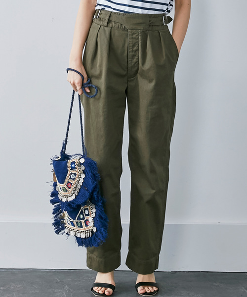 「独特のウエストバンドを生かしつつ新鮮に」 幅広のウエストバンドや、前でクロスさせたタブベルトなど、ヴィンテージのグルカパンツの仕様を踏襲しつつ、今はきたいシルエットやサイジングで表現した一本。ハイウエストでヒップまわりはゆったり、セミワイドなシルエット。洗いをかけてアタリや風合いを出したコットン生地は、やさしいはき心地です。 #ミリタリーパンツ
