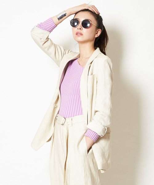 リラックス感のあるダブルジャケットです。ナチュラルな麻と光沢のあるレーヨンにシルクが入った、風合い良く品の良いキャンバス素材を使用。暑い時期にも心地よく身に着けられ、ナチュラルなシワ感も魅力です。発色の良さを生かしたオレンジと肌色が良く見えるベージュ、どちらもNINEオリジナルカラーです。大きめのメンズライクなサイジングが今の気分にぴったり。敢えてレースのボトムなど、女性らしいアイテムを組み合わせることでフェミニンさがぐっと引き立ちます。上から太目のサッシュベルトなどを巻いてしまうトレンド感のある着こなしもお勧めです。同素材のパンツと合わせればセットアップでお召しいただけます。