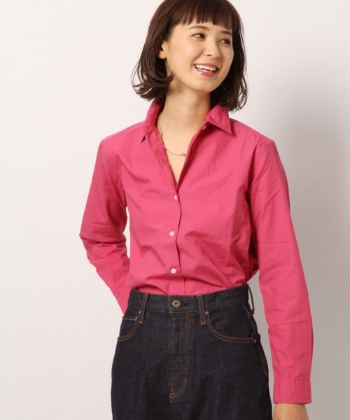 襟にワイヤーが入ったシャツ♪ ベーシックシャツの襟にワイヤーを入れて決まりやすい仕様に仕上げています。 ピンクやカーキといった春らしいカラーリングのほかに ドットやギンガムチェックとバリエーションも豊富なので カジュアルにも、オン使用でも着ていただける優れもの。 ボタンを二つほど開けて抜け感を出す着方がオススメです♪