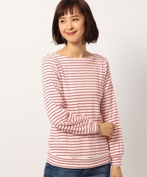 万能活躍!インナーカットソー♪ リブ素材のインナーカットソーは1枚でもレイヤードスタイルでも重宝するアイテムです。 表面に凹凸のあるリブ素材が存在感もあり、ネック部分はデコルテが綺麗に出るボートネックデザイン。 女性らしい華奢な雰囲気を引き立てます。 袖は少しボリュームのあるデザインなので、袖部分でニュアンスをつけた着こなしもおすすめです。 ネイビー(ボーダー)89はWEB限定カラーですので、ぜひご覧ください♪