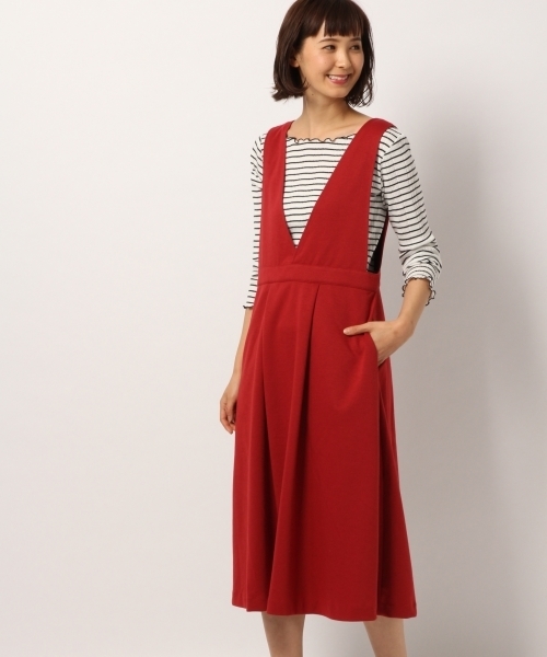 デザインがポイント!カット素材で柔らかい素材感のジャンスカ!Vラインと後ろ部分のジップ使いで上部はすっきりと、スカート部分からややフレアなシルエットで女性らしく1枚でも着やすい着丈が大人っぽいのもポイントの1枚です。カットソーやニットとの相性も良く、今年はシャツやブラウスとのスタイリングがおすすめ!様々な着こなしをお楽しみください♪