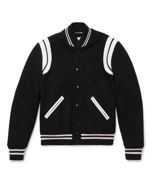 One of Saint Laurent 's most popular modern designs, this bomber jacket is influenced by the Teddy Boys of the 1950s. It's been made in Italy from black wool-blend and is accented with full-grain leather details and ribbed trims that give it a sporty appeal. Shown here with Saint Laurent jeans, Saint Laurent T-shirt, Saint Laurent boots. - - Black wool-blend - Two front welt pockets, leather panels, ribbed trims, two internal pockets, fully lined - Snap fastenings - 90% wool, 10% polyamide; trim1: 100% leather (lamb) - Specialist clean - Made in Italy