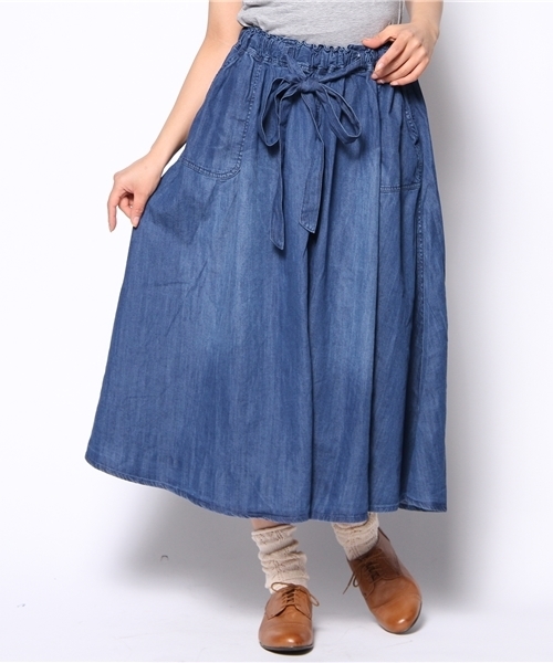 柔らかなライトオンスデニム生地をつかったロング丈のフレアスカート。 ウエストベルトや大きめのポケット、ステッチ使いなどディティールに こだわりを感じさせる一枚です。くたっとした風合いなので、 履き心地も軽やかにナチュラルに着こなせるスカートです。 中国製品番:76701083002 model:H160 B81 W63 H92 着用サイズ:フリー