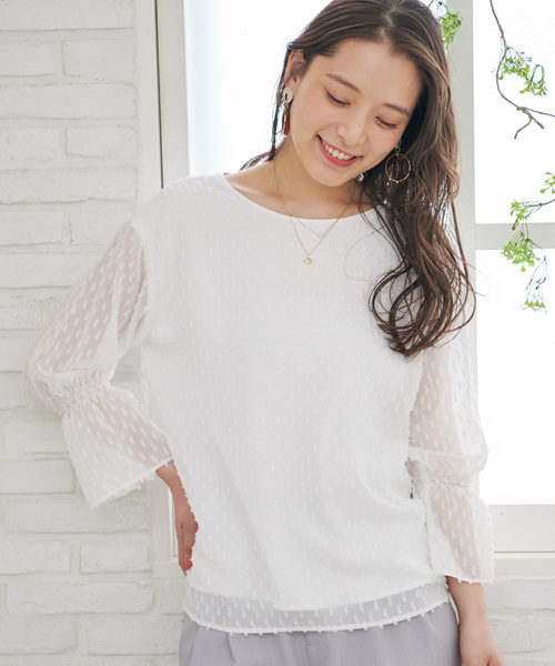 表情豊かなドビー素材でふわりとした軽さを華やかさをプラス。旬のスリーブコンシャスアイテムです立体感のあるドビー素材は、ドット風の素材感でキュートな印象に。 これからの季節にぴったりなふわりと軽いディテールは、ほんのりとしたシアー感が旬な雰囲気を演出してくれます。 ふわりとしたボリューム感が魅力のキャンディスリーブで、程よく甘さのあるフェミニンブラウスに。 トップスインでも出したままでも決まる着丈です。 見ごろ部分に裏地がついており、袖にはついておりません。
